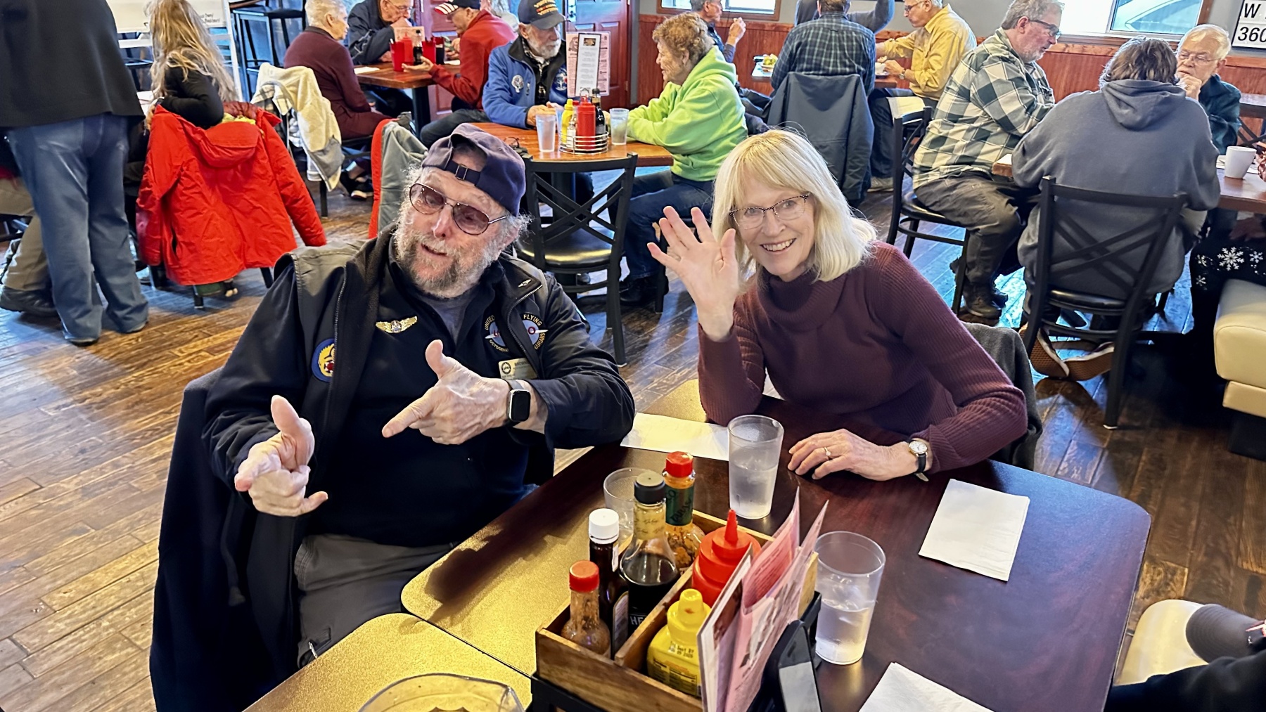 It’s always a challenge for the restaurants we visit on our flyouts to seat people in a large group near each other. Most do a great job, as did Ellie’s this day. Seating took three tables which were adjacent, allowing visible communication for all and audible communication among most. Windows provided views of airplanes taking off and landing, what more could we ask for? Service was excellent – hats off for Ellie’s!