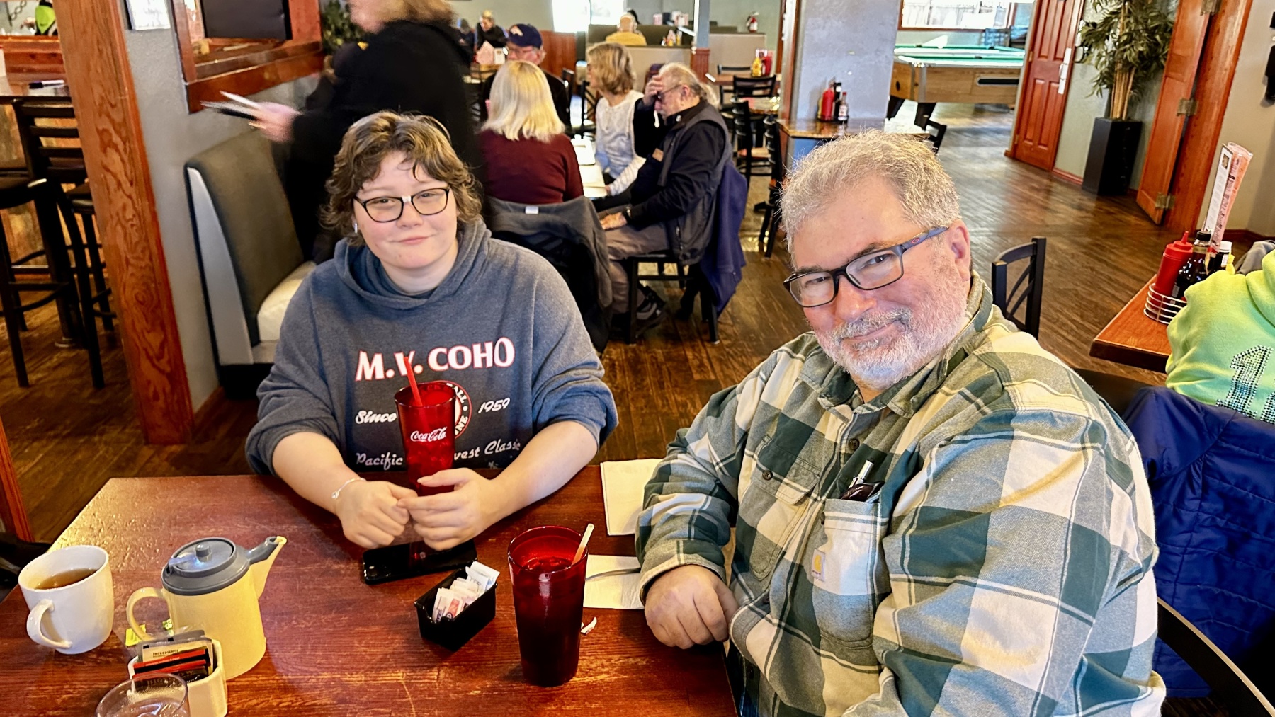 Lunch was at the Blakeslee Bar and Grill, and as usual the food and service were excellent! Once again they seated all flyout guests at one table.  Members included Scott Alair (Lancair Legacy), Ken Brown (RV-9A), Brendan Carmody (RV-12), Bill Benedict with guest  (RV-14), Ray Ballantyne with Barry Halsted (PA-11)), Tom Roorda (RV-6), Mark Long with Drew Zacharias (Pipistrel Sinus), Dave Miller (Super Legend Cub) and Aidan Lara with Andy Sallee (C-172). All these folks arrived within minutes of each other except for Aidan and Andy who left Sequim Valley Airport a bit late having to wait for an airplane ahead of them at the fuel pump.